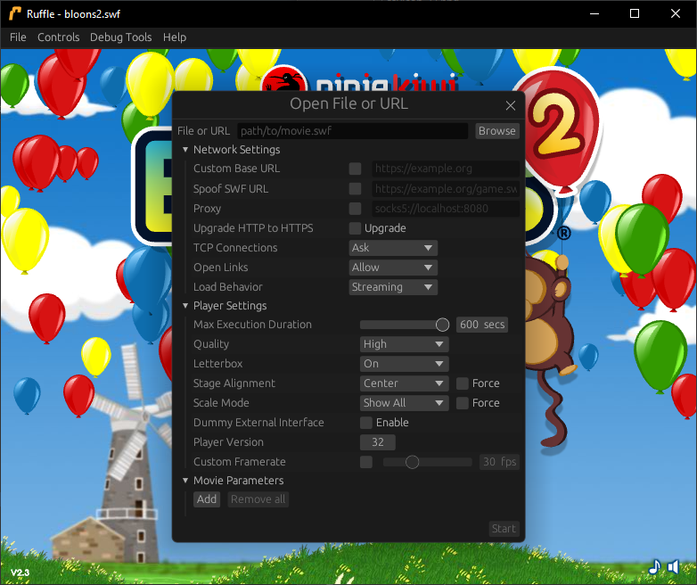 Whilst we had a super basic UI introduced in our last blog post, now it's even better! It's still as simple to use as before, but the new Advanced Open menu has many new options you can toggle to change how content plays - plus we've added a host of brand new debug tools that even Flash Player didn't have!